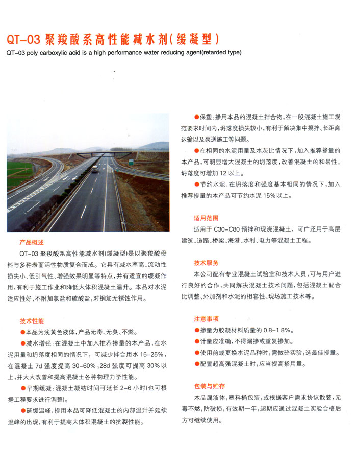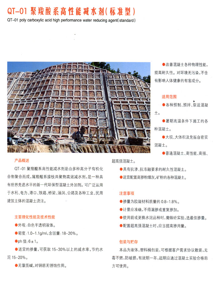 聚羧酸系高性能減水劑(緩凝型)是以聚羧酸母科與多種表面活性物質(zhì)復(fù)合而成?沽褱p水劑19:10 2016-4-19具有減水率高、流動(dòng)性損失小、低引氣性、增強(qiáng)效果明顯等特點(diǎn),并有適宜的緩凝作用,有利于施工作業(yè)和降低大體積混凝土溫升。本晶對(duì)水泥適應(yīng)性好,不附加氯鹽和硫酸鹽,對(duì)鋼筋無銹蝕作。