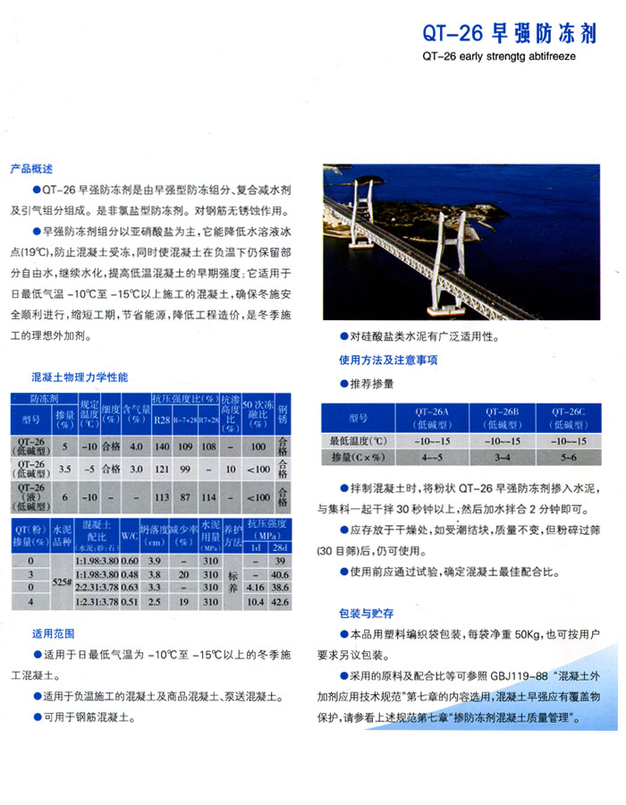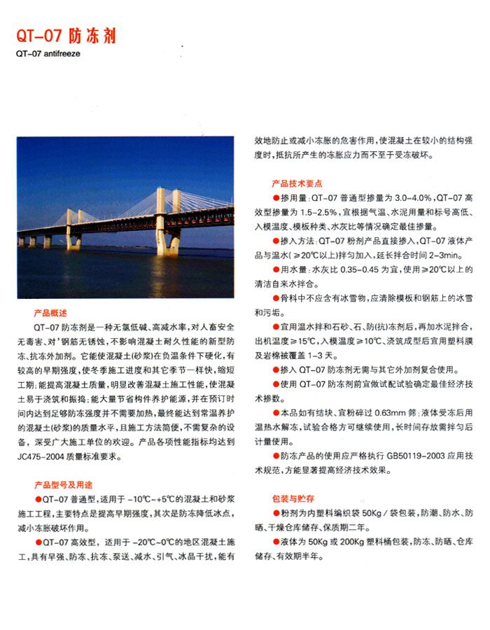 1.QT-07普通型防凍劑,適用于—?0℃~+5℃的混凝土和砂漿施TT程,主要特點是提高早期強(qiáng)度,其次是防凍降低冰點,減小凍脹破壞作用。